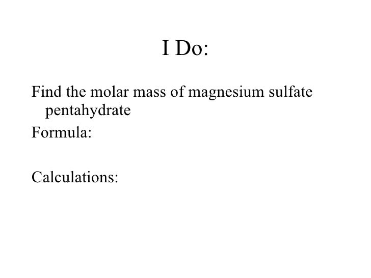 Calculate the molar mass of magnesium sulfate in grams per mole or search for a chemical formula or substance. Record the mass in the calculations table. To complete this calculation, you have to know what substance you are trying to convert. It is found in the form of hydrates and double salts in salt and potash deposits. 48.8 g mgso4 & 51.2 g h2o convert the mass into moles by dividing molar mass for each.